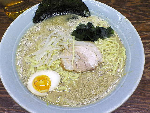 家系らしく太麺にチャーシュー、海苔、ホウレン草じゃなくモヤシにワカメ、味付玉子がデフォで入ってました。
