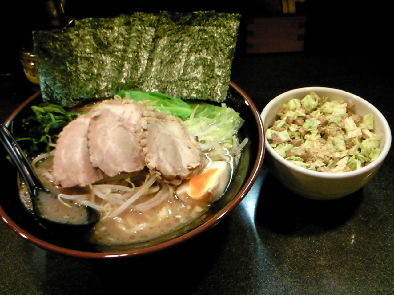 具材は、チャーシューに味玉半分、キャベツ、モヤシ、ホウレン草、海苔8枚、薬味葱等。