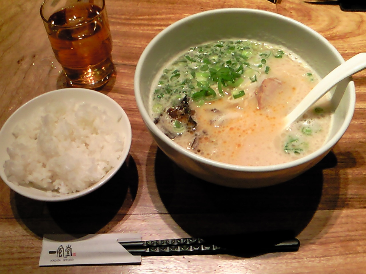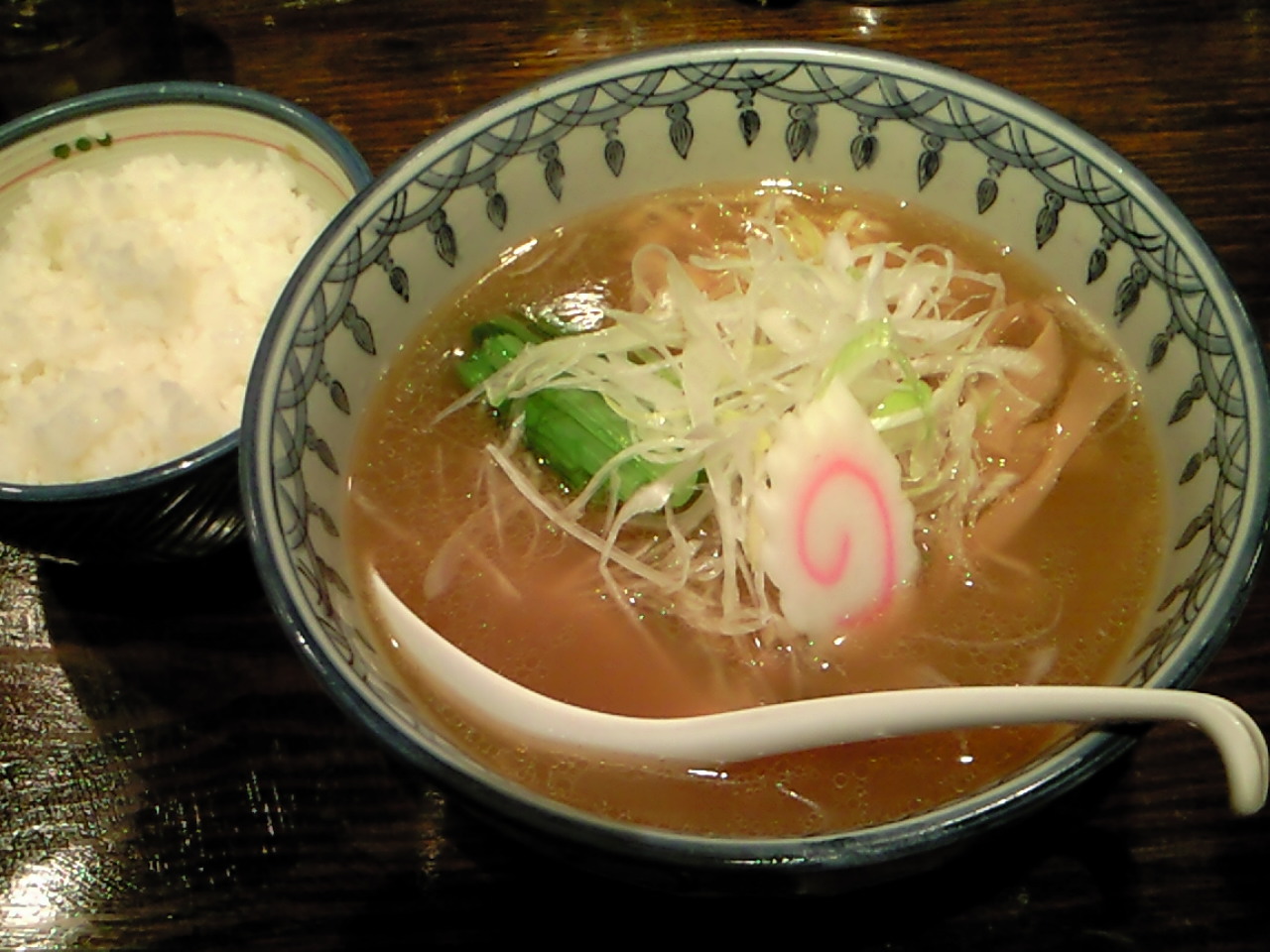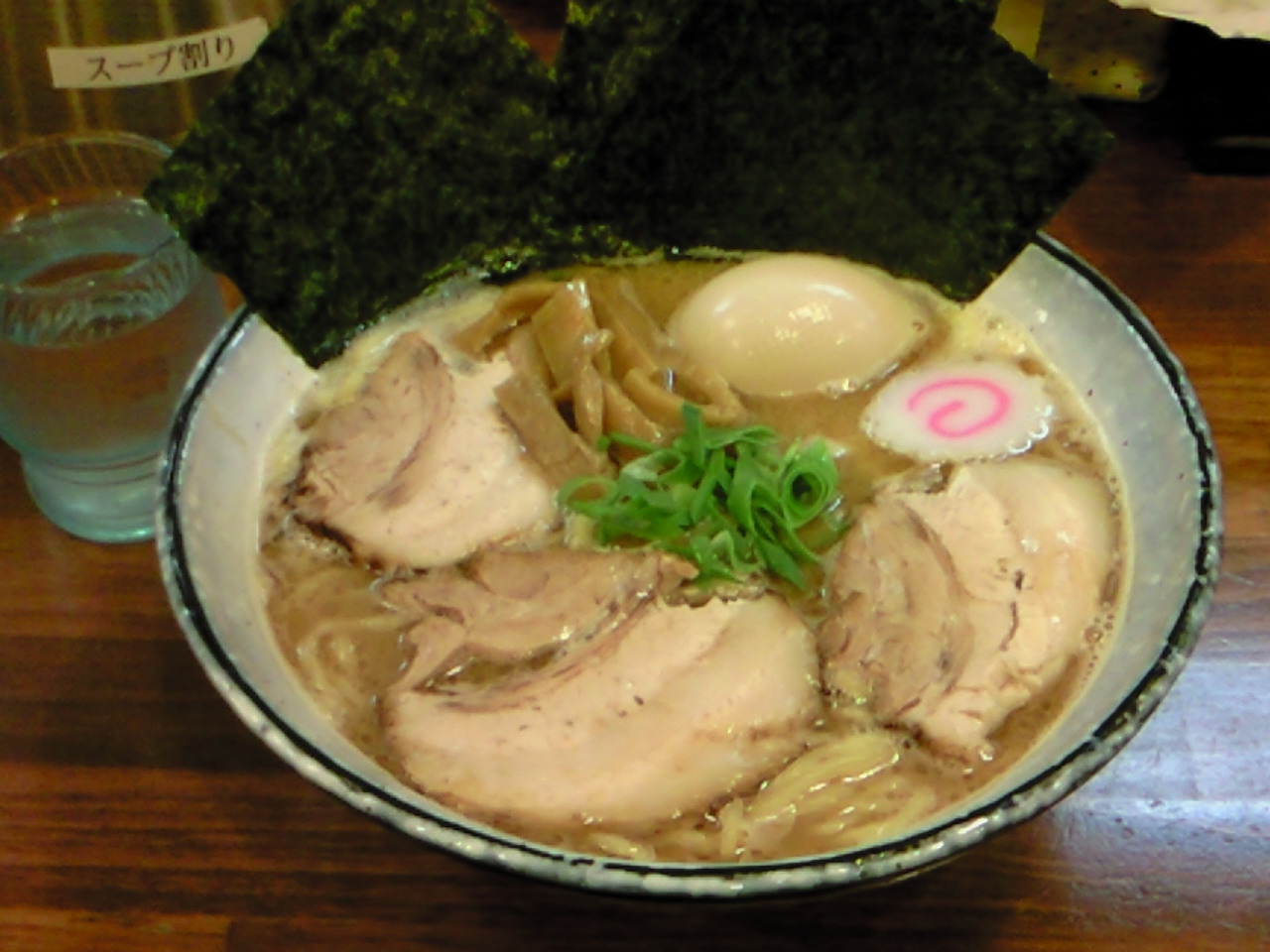 具材は、チャーシュー、メンマ、ナルト、菜っ葉、白髪葱等。