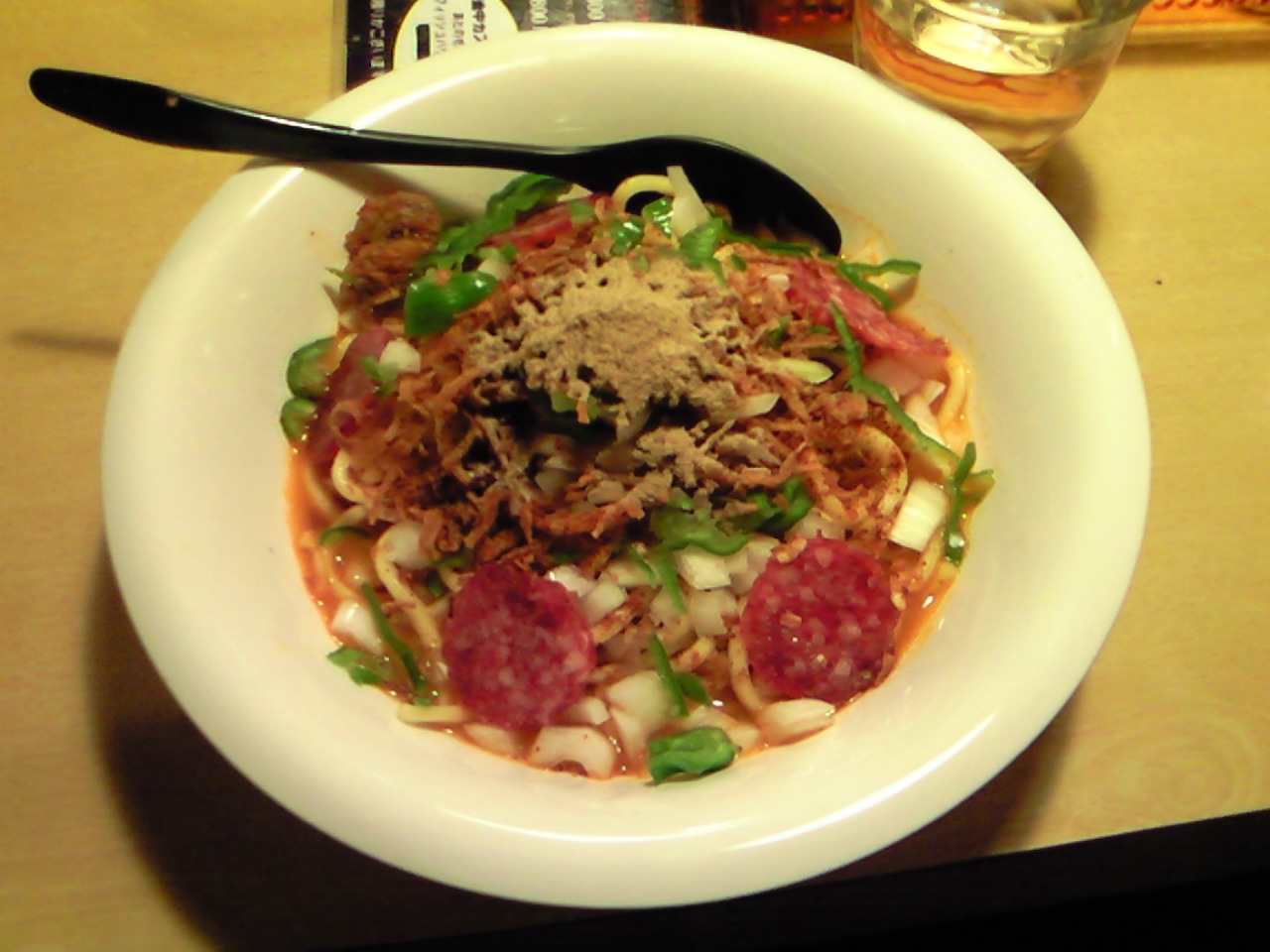画像を見て分かるだろうか…こいつはピザ味の汁なしと言うか、まぜそばである。