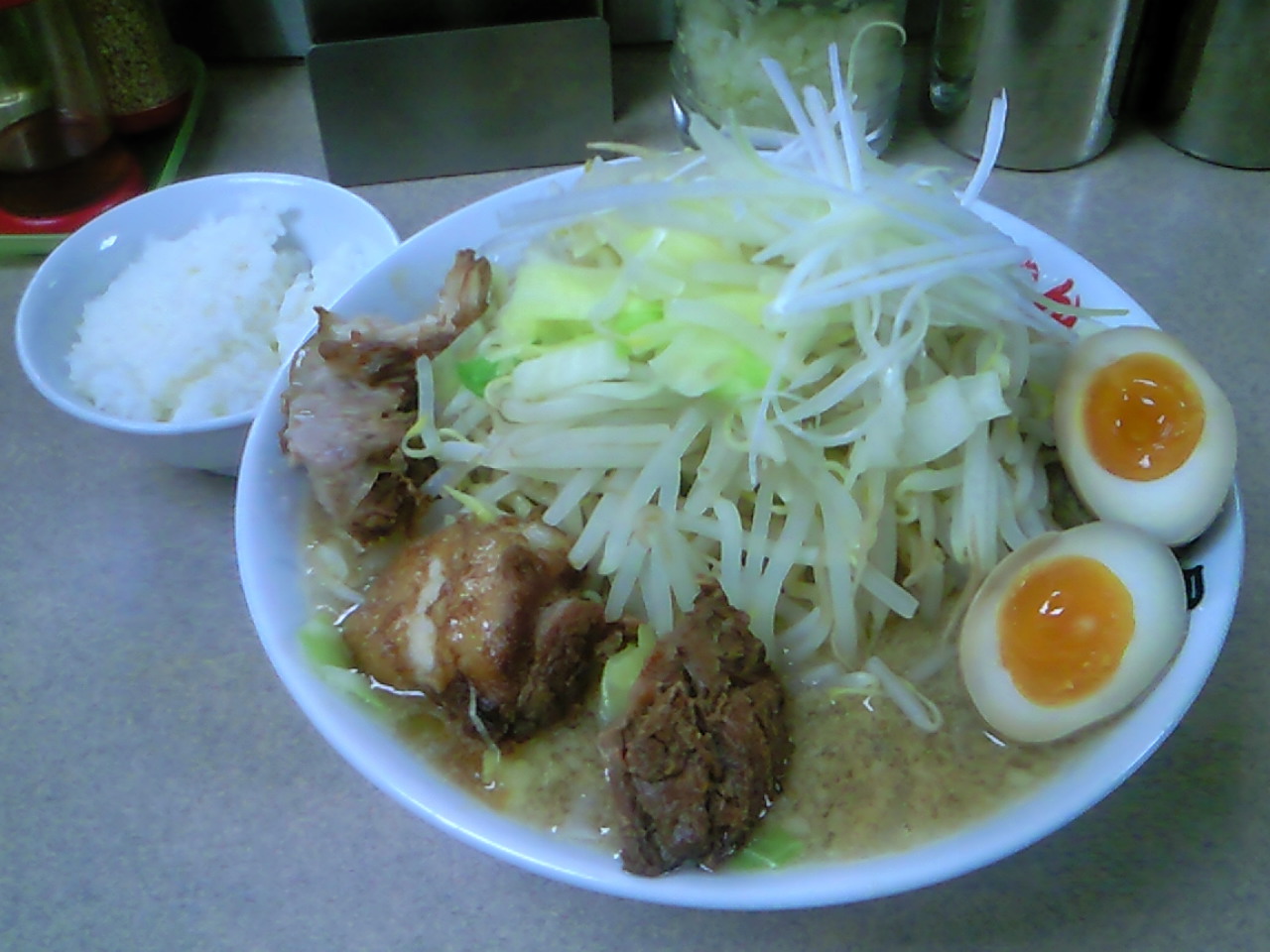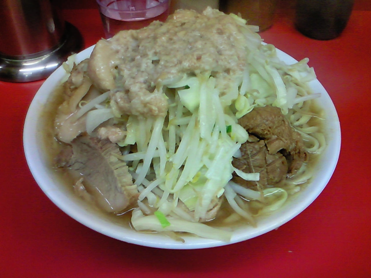 野猿みたいに小さめの丼にてんこ盛りって訳でもなく、スモジみたいに圧倒的にでかい丼に盛ってる訳でもなく、二郎の標準的な大の容量の丼。