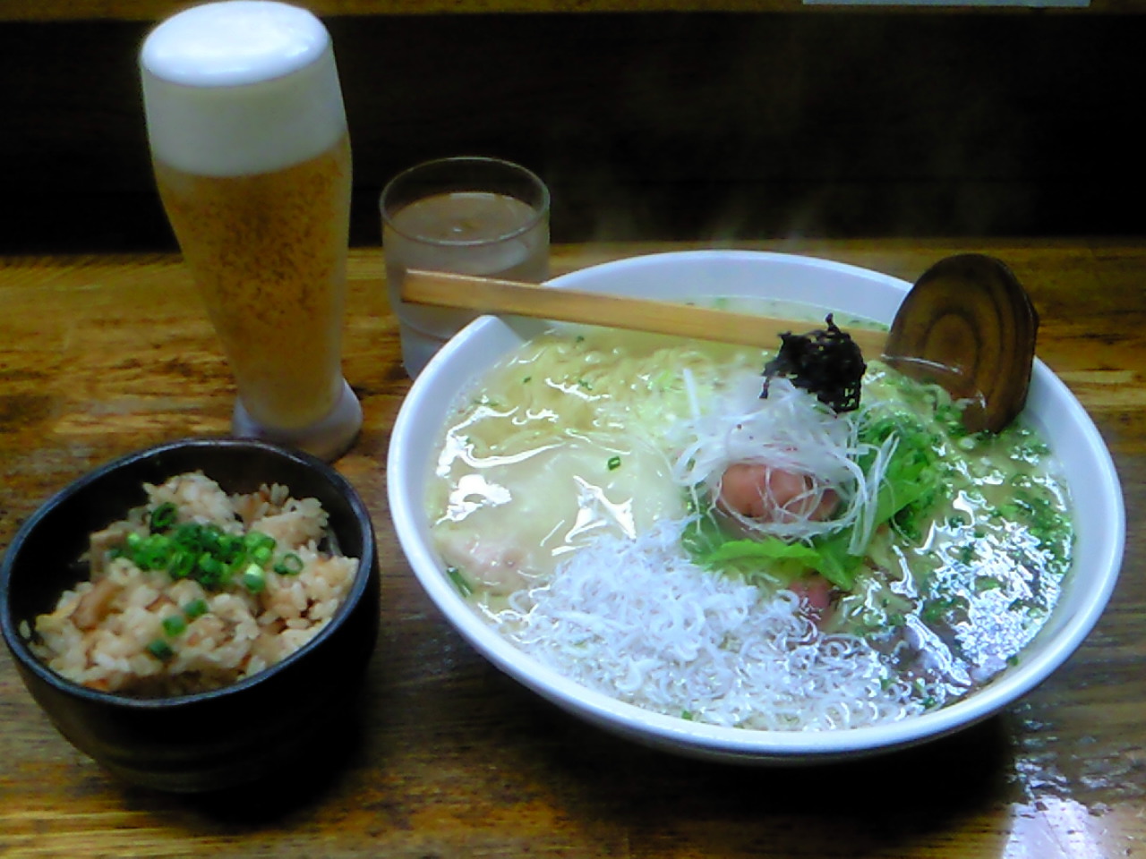 梅しらす塩らー麺大盛り・麺硬め、炊き込みご飯、グラス生ビール♪♪♪♪