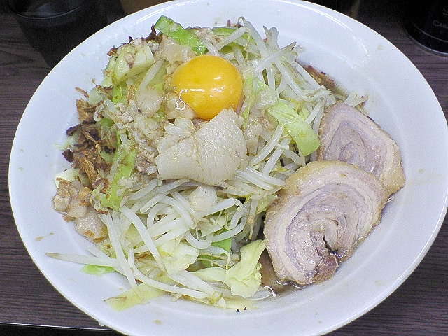 後半、生卵を潰して、麺やヤサイ、ブタと共に胃袋へ挿入。